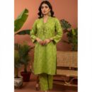 - Design: The neckline is a deep V-neck style, embellished with a braided trim that outlines the V and extends down the front placket. The placket is adorned with a series of matching green buttons