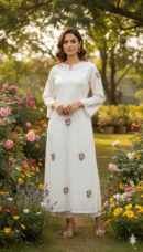 Elevate your everyday look with this elegant white embroidered suit, crafted from soft, breathable textured fabric. The design features delicate multicolor floral embroidery on the front and sleeves, adding a subtle yet graceful touch.